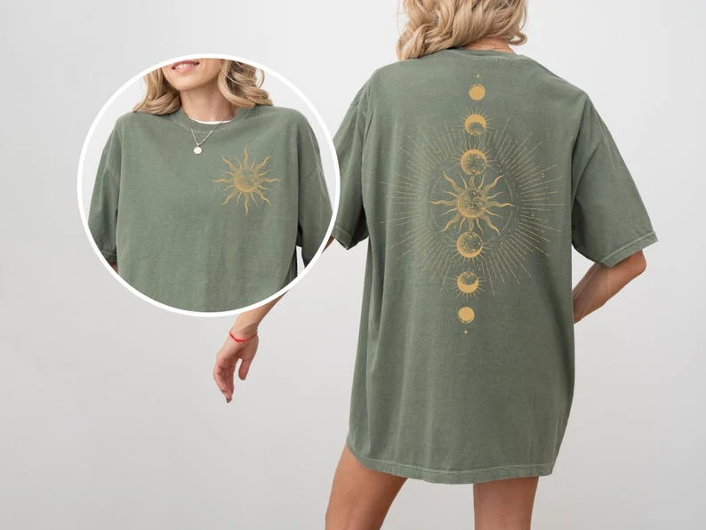 Embrace your inner celestial goddess with this beautiful moon phase shirt. This Comfort Colors shirt features a stunning sun and moon graphic, perfect for anyone who loves astronomy or a touch of witchy, boho style. The garment-dyed, vintage-washed fabric gives it a perfectly worn-in feel, making it an ideal oversized tee for stargazing or cozy nights in.