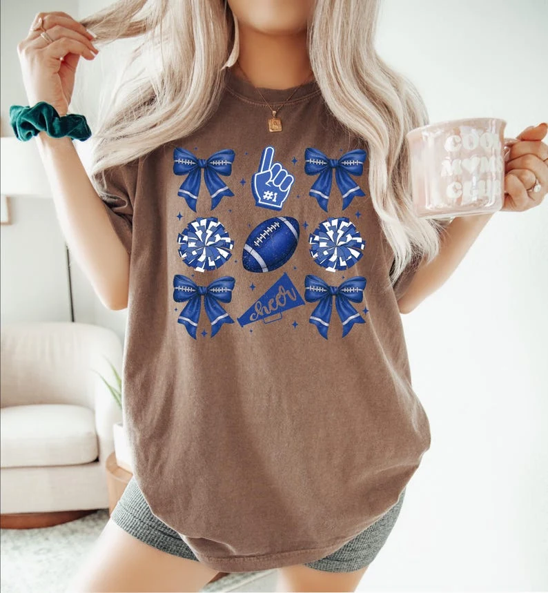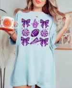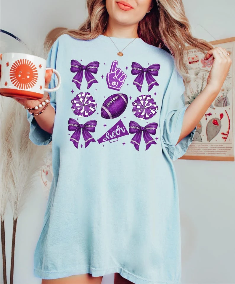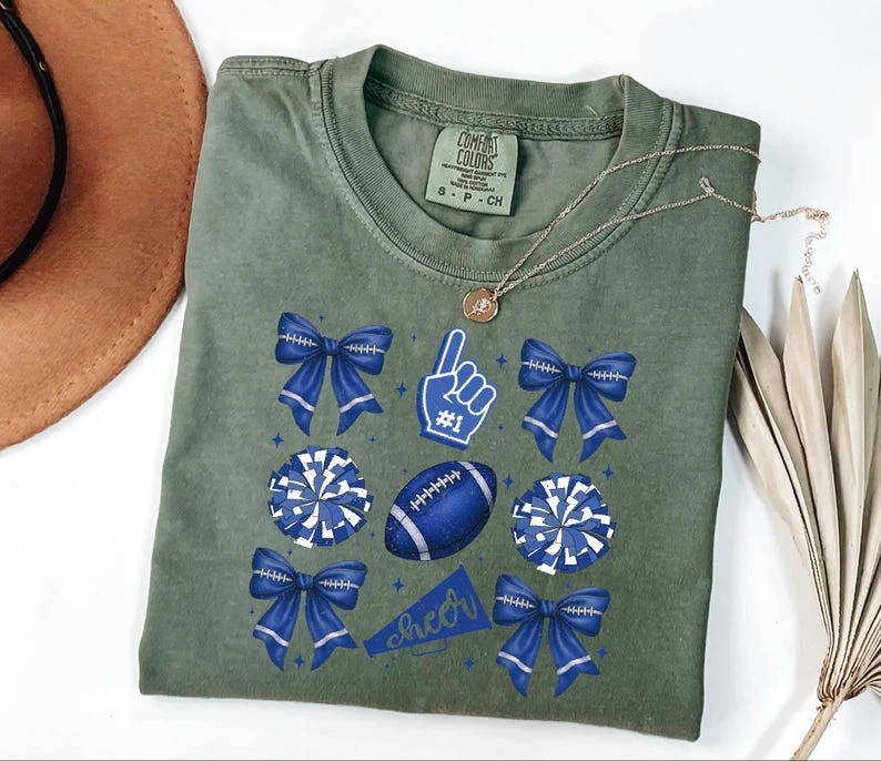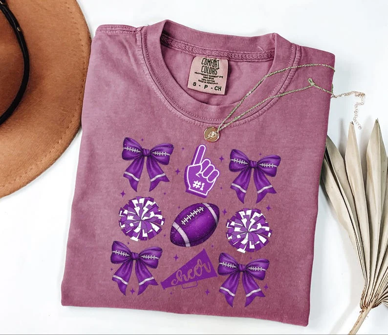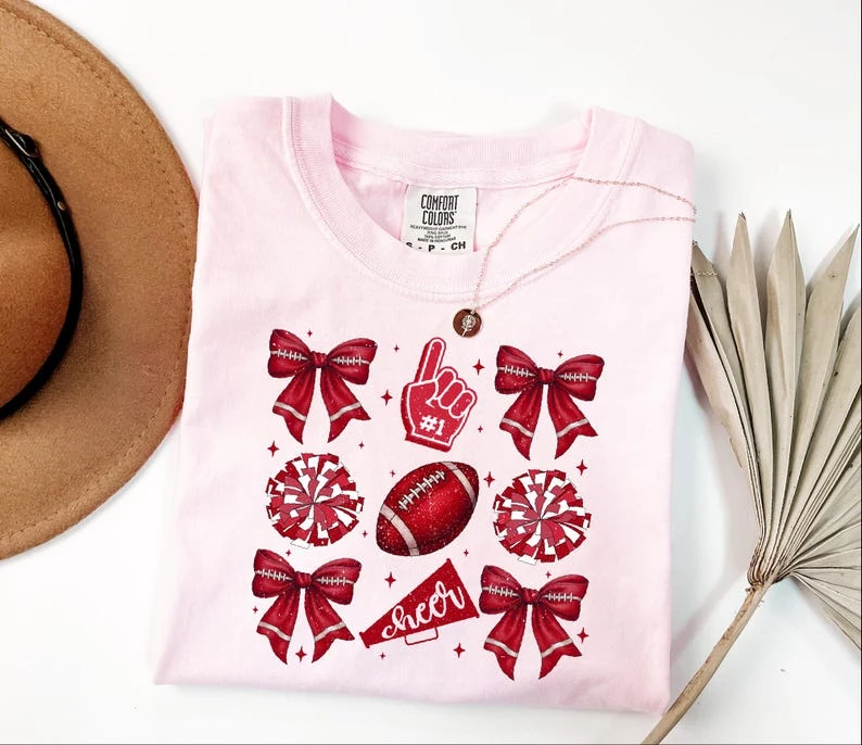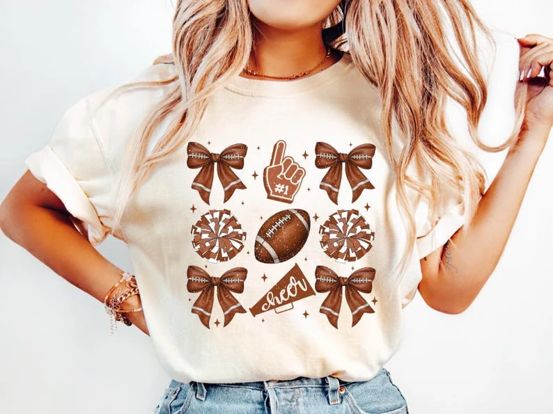 Show your team spirit with this charming coquette-inspired football shirt, perfect for cheerleaders, students, and fans who love a feminine touch. Featuring a stylish bow design, it’s a great choice for game days, pep rallies, and celebrating the cheerleading season all autumn long.