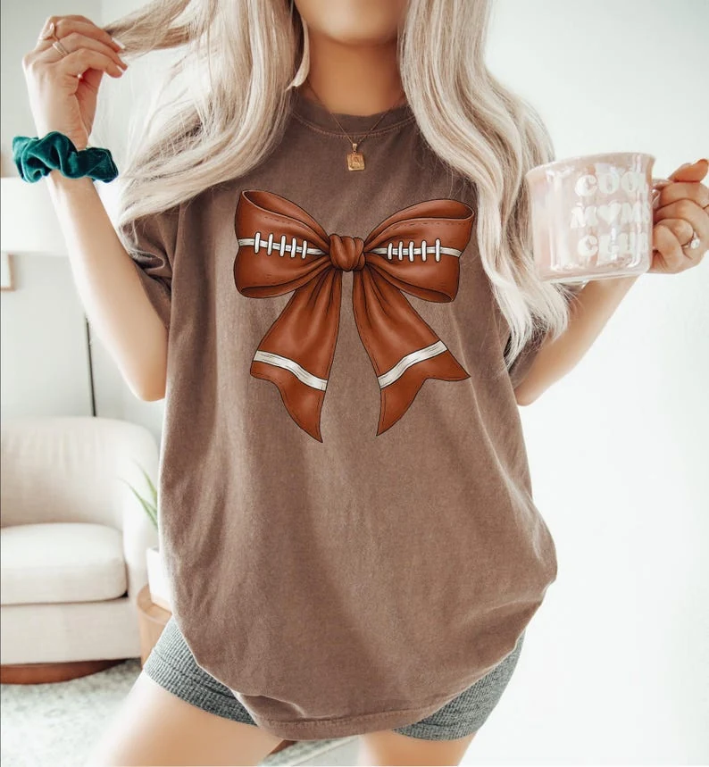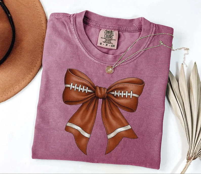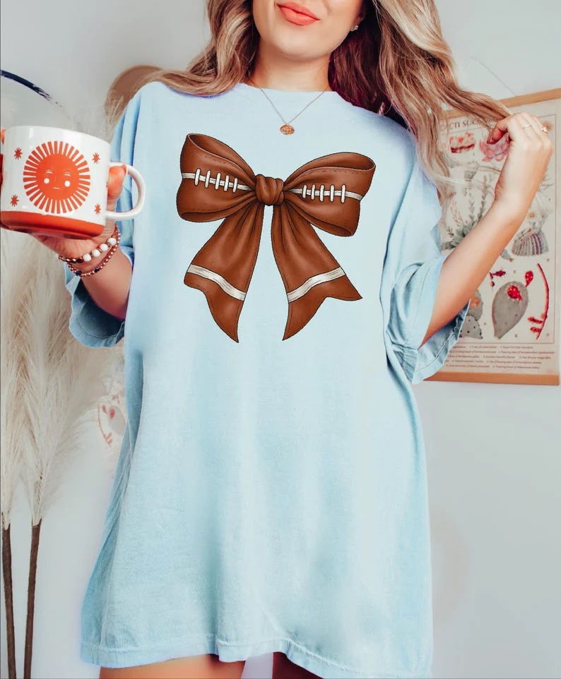 Get ready for football season with the perfect blend of sporty and sweet. This Comfort Colors® football bow shirt is the ultimate way to show your school spirit. Made from soft, garment-dyed fabric, this vintage-washed tee offers a trendy, oversized fit that’s perfect for game days, tailgates, or just showing off your love for the game. The coquette bow design adds a touch of feminine charm to a classic football shirt.