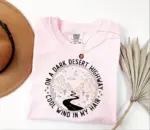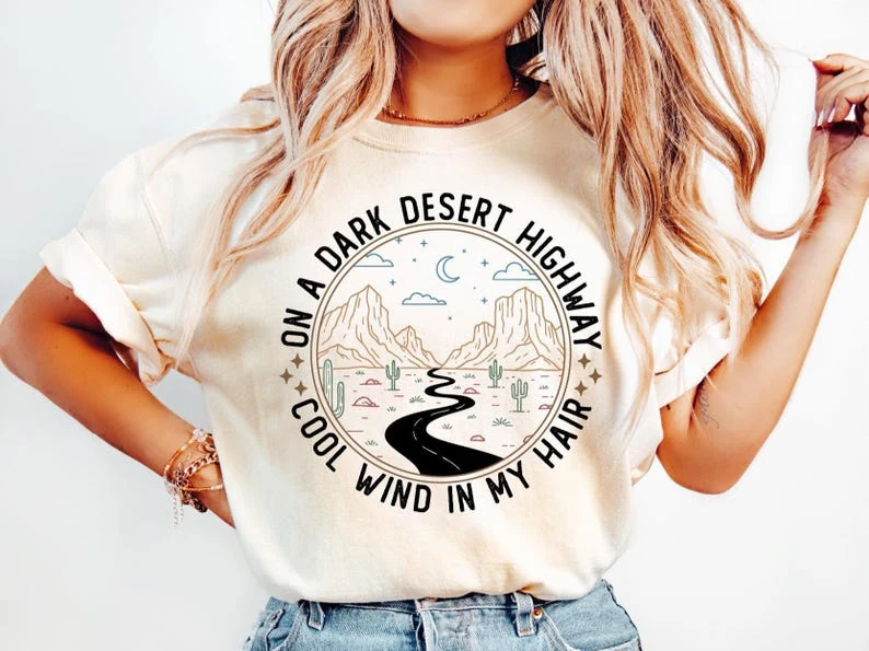 Hit the open road with our Dark Desert Highway t-shirt, a perfect tribute to classic rock and a free-spirited lifestyle. This outdoor adventure-themed top is an excellent choice for road trippers, music lovers, and anyone who feels the call of the wild. It’s a great gift for friends, family, or yourself for your next journey.