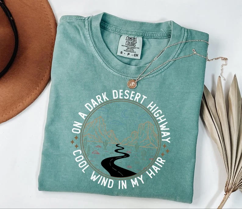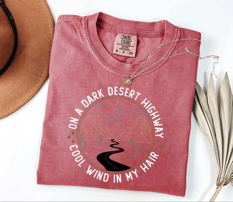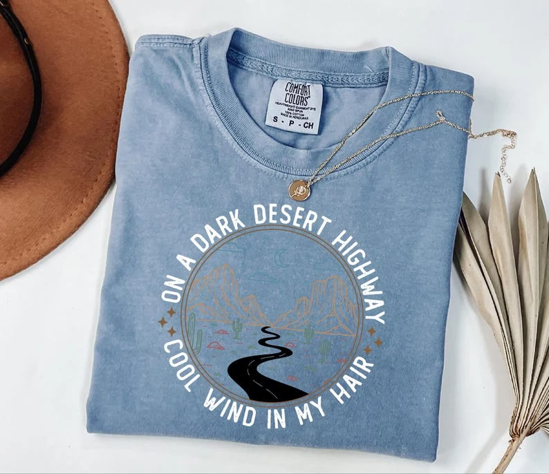 Embrace the spirit of the open road with this “On A Dark Desert Highway” shirt, the perfect adventure shirt for your next journey. This vintage washed tee captures the essence of desert landscapes and mountain trails, making it an ideal travel shirt for explorers and dreamers alike. The unique garment dyed fabric gives it a soft, broken-in feel, perfect for camping under the stars or a spontaneous hiking trip.