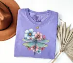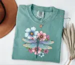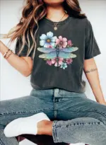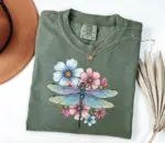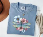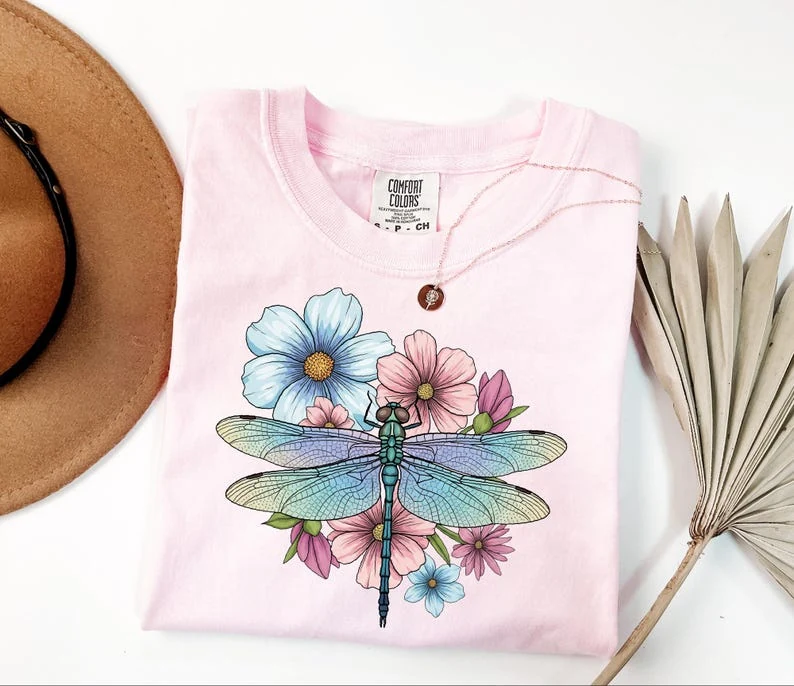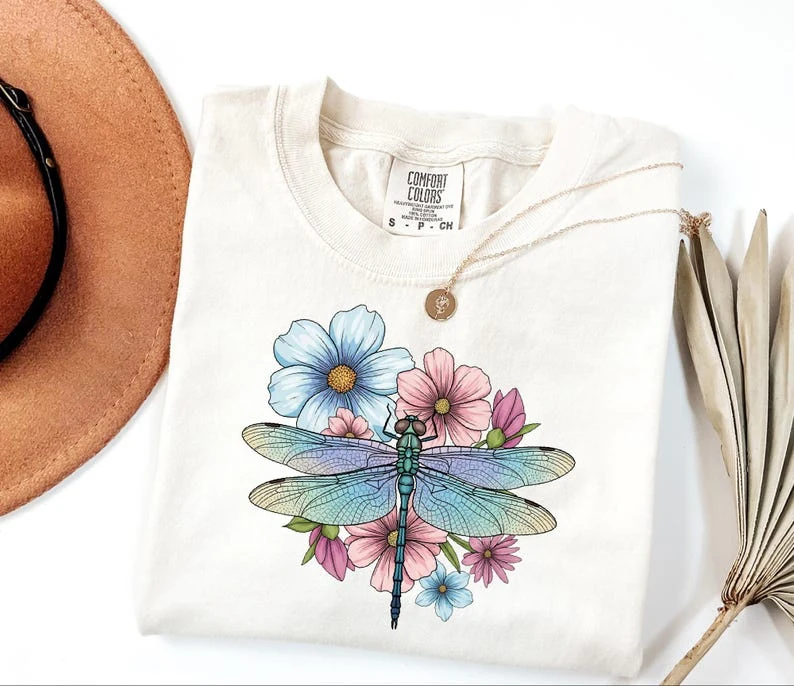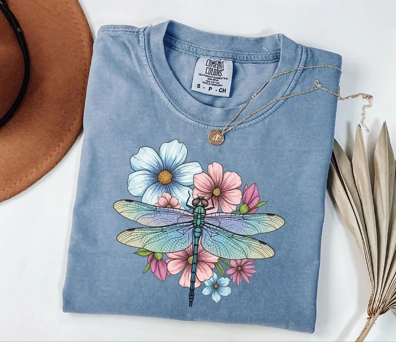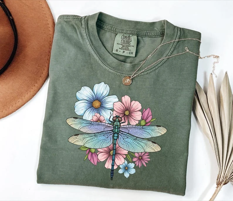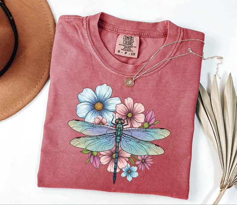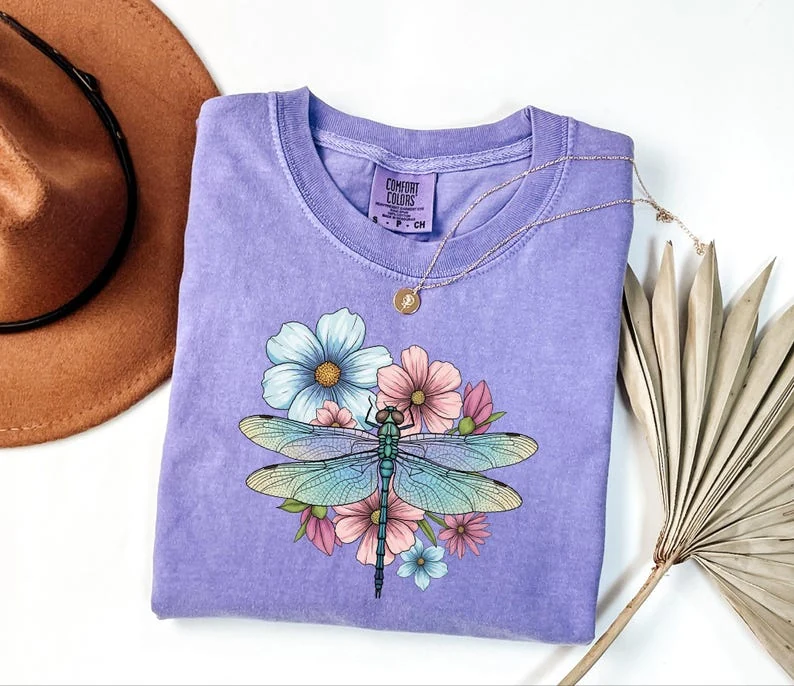 Embrace your inner nature lover with this beautiful dragonfly floral shirt. This Comfort Colors shirt features a stunning botanical design, perfect for any garden enthusiast. The garment-dyed tee has a vintage washed look that gives it a lived-in, cozy feel, and its relaxed unisex fit makes it an ideal oversized tee for a cottagecore aesthetic.